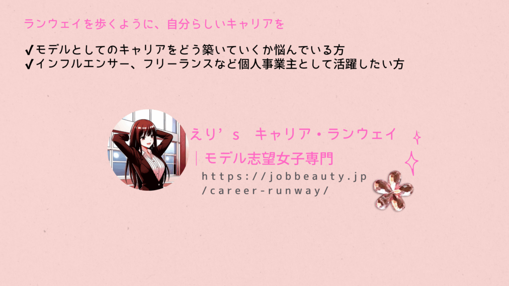 モデルの仕事は、あなたのルックス(外見)だけでは長く続きません。プロ意識、自己管理能力、そしてビジネス戦略が不可欠です。「えり’s キャリア・ランウェイ」は、この業界を**「ブランディングされたあなたの為の仕事」**として勝ち抜き、長く輝き続けるための専門プログラムです。