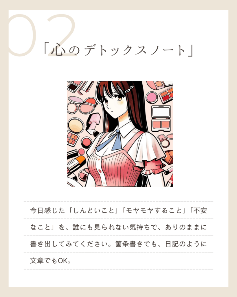 | 心のデトックス | 書き出したノートは、誰にも見せず、読み返す必要もありません。感情を紙に「吐き出す」ことで、心の中をすっきりさせよう。 | ⬜︎ 誰にも見られない場所で書いた |