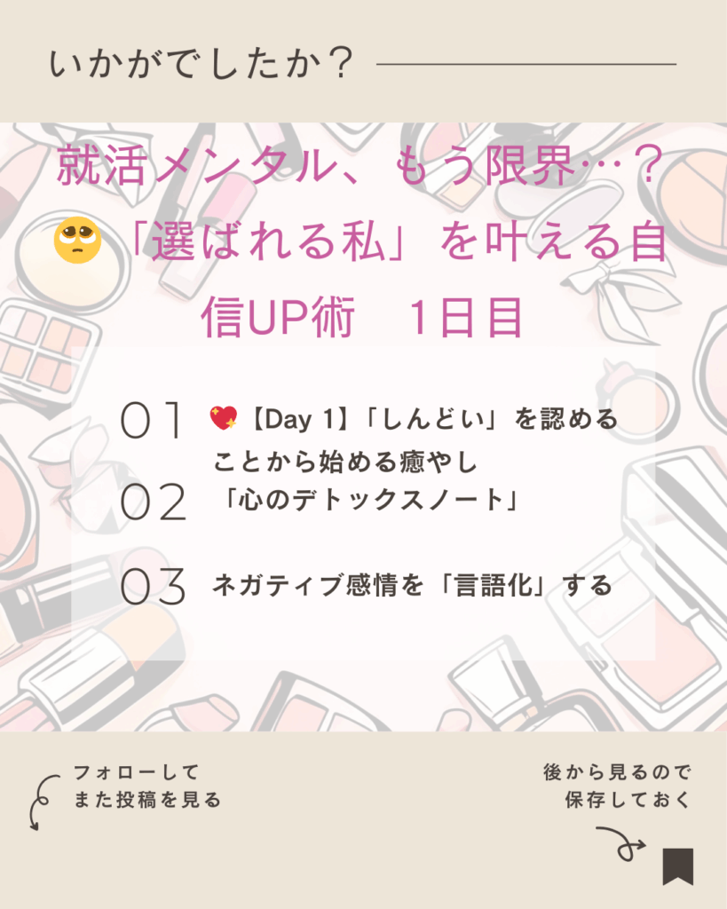 就活のプレッシャーの中で、私たちはつい「弱音を吐いちゃいけない」「もっと頑張らなきゃ」と自分を追い込みがちだよね。でも、まずはその**「しんどい」という感情を、丸ごと受け止めてあげましょう。**