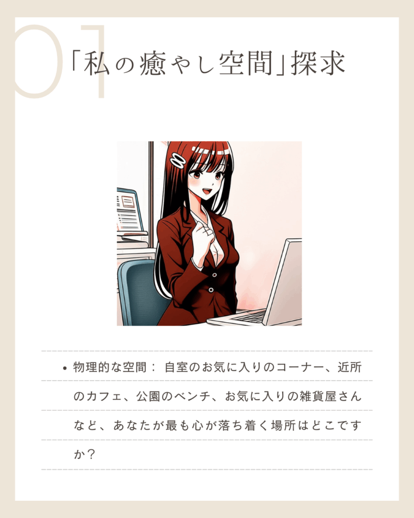 | 癒やし空間の探求 | あなたが心から落ち着ける場所や空間を、物理的なものと内面的なものの両方から探してみよう。 | ⬜︎ 落ち着ける場所を3つ書き出した |