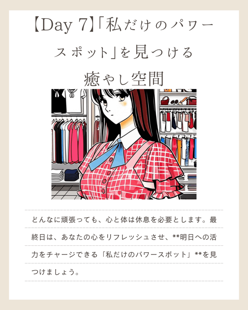 最終日の今日は、頑張ったあなた自身を最高に癒す「魔法」を教えちゃう。それは、心と体が本当に喜ぶ「私だけのパワースポット」を見つけること。どんなに頑張っても、心と体は休息を必要とするからね。