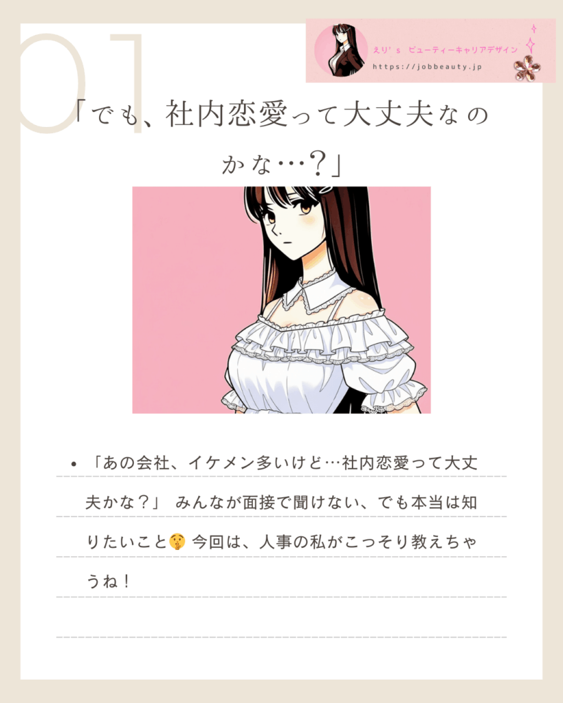 ねぇ、「あの会社、イケメンが多いけど…社内恋愛って大丈夫かな?」「入社したら、素敵な出会いはあるかな?」