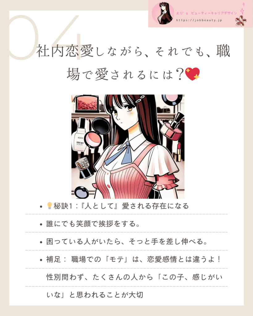 | 💡秘訣1:『人として』愛される存在になる | 全方向への敬意 | 性別や役職に関係なく、誰にでも笑顔で挨拶をし、感謝を伝える。特定の人にだけ媚びない。 |