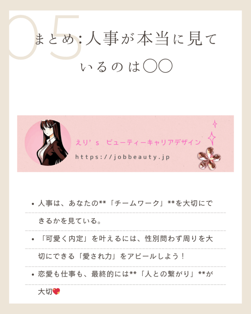 まとめ:人事が本当に見ているのは、あなたが**「チームワーク」を大切にできるか、あなたの「愛され力」**がチームにポジティブな影響を与えるか、よ。