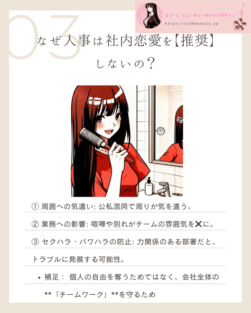 人事が社内恋愛に慎重になるのには、個人の自由を奪うためではなく、会社全体の**「チームワーク」と「リスク」**を守るためという明確な理由があります。