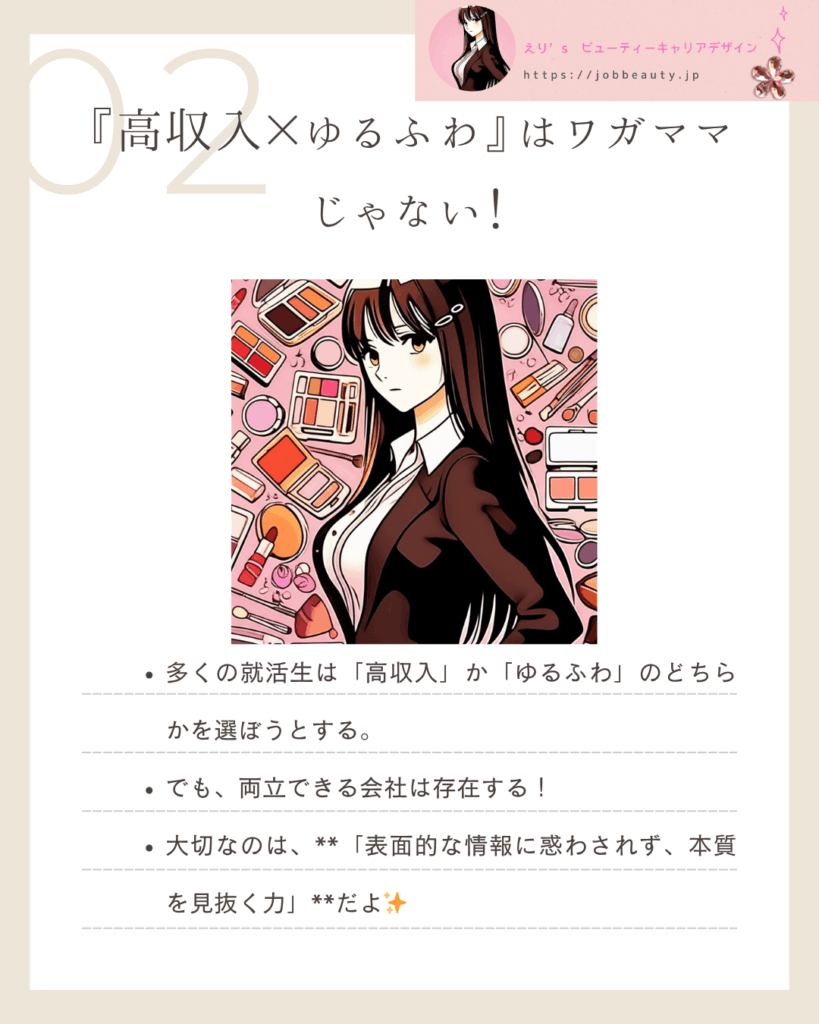 ねぇ、そんなわがままな願い、実は叶うって知ってた?💖 多くの就活生は、「高収入」か「ゆるふわ」のどちらかを選ぼうとして、どちらかを諦めがち。でも、人生の幸福度を最大化するには、両立できる会社を見つけるのが最高の戦略よ!