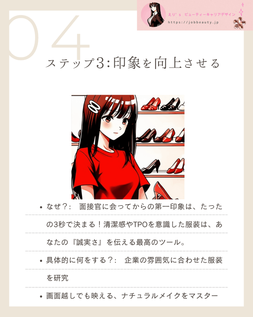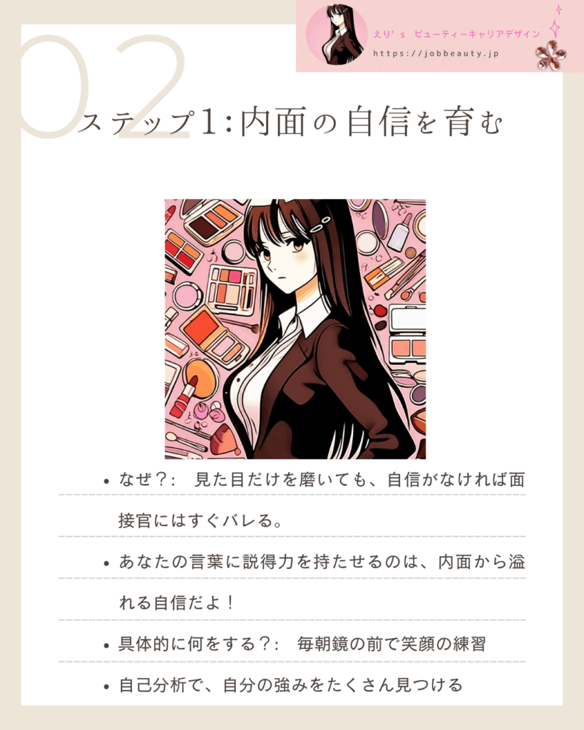 なぜ?:見た目だけを磨いても、内面から溢れる自信がなければ、面接官にはすぐバレてしまうわ。あなたの言葉に説得力を持たせるのは、揺るがない自己肯定感よ!