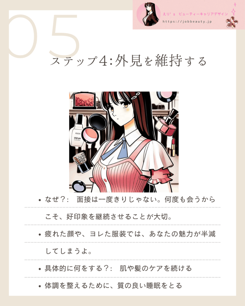 なぜ?:面接は一度きりじゃないわ。何度も会うからこそ、好印象を継続させることが、あなたの**『プロ意識』**を伝えるの。疲れた顔や、ヨレた服装では、あなたの魅力が半減してしまうわ。