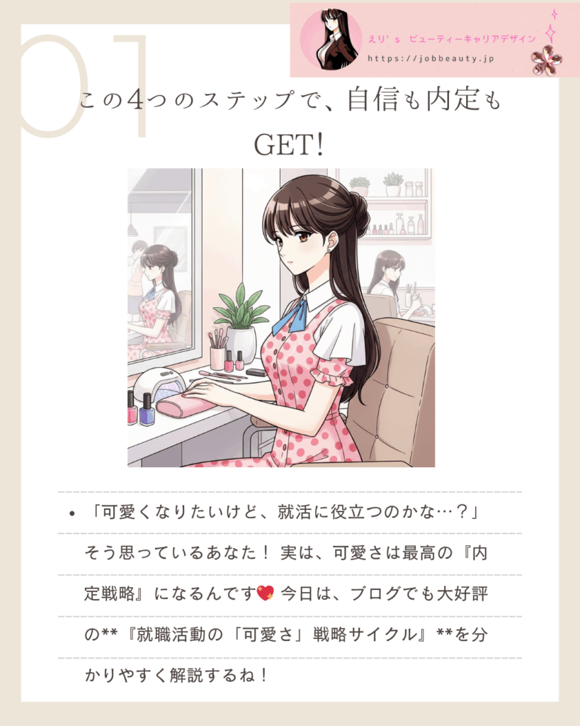 就職活動における「可愛さ」とは、**「愛され力」と「信頼感」の融合よ。この4つのステップを戦略的に実践することで、あなたは企業から「選ばれる私」**になれるわ。