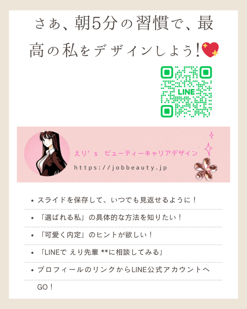 「可愛くなる習慣」とは、最高の自己管理とセルフラブのこと。朝5分の習慣で、あなたの愛されオーラとパフォーマンスは確実に変わるわ!今日から最高の私をデザインして、全てのシーンで選ばれる女性になりましょう!