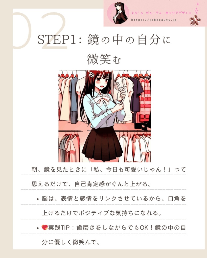 STEP 1鏡の中の自分に微笑む即効性の自信:表情をコントロールし、ポジティブなオーラを瞬時に作る。
