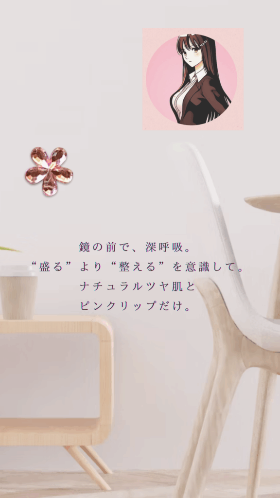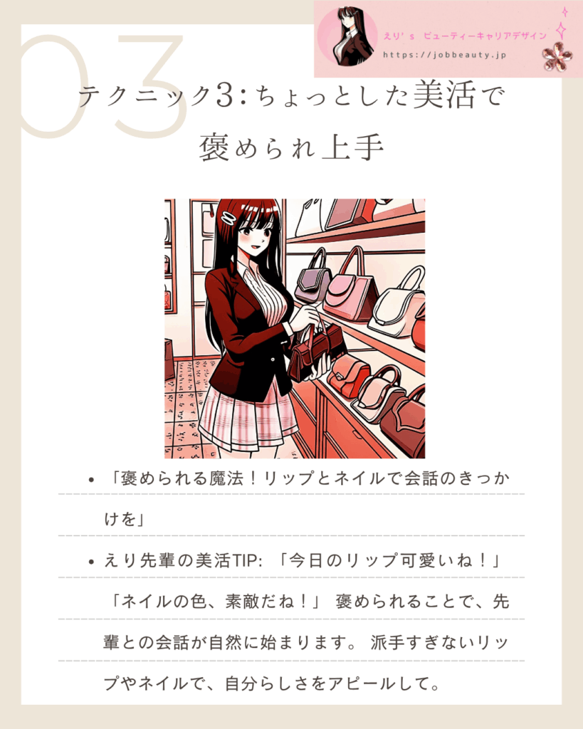 | 3. ちょっとした美活で褒められ上手 | 会話のきっかけを作り、愛されオーラを視覚的にアピール。 | 「親しみやすさ」:コミュニケーションの扉を開き、相談しやすい雰囲気を作る。 |
