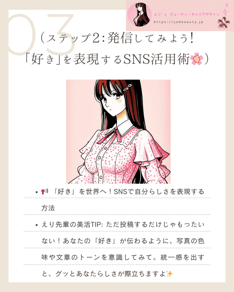 | ステップ2 | 「好き」を表現するSNS活用術🌸 | ブランド発信軸:統一感のある方法で、あなたの魅力を世界に届ける。 |