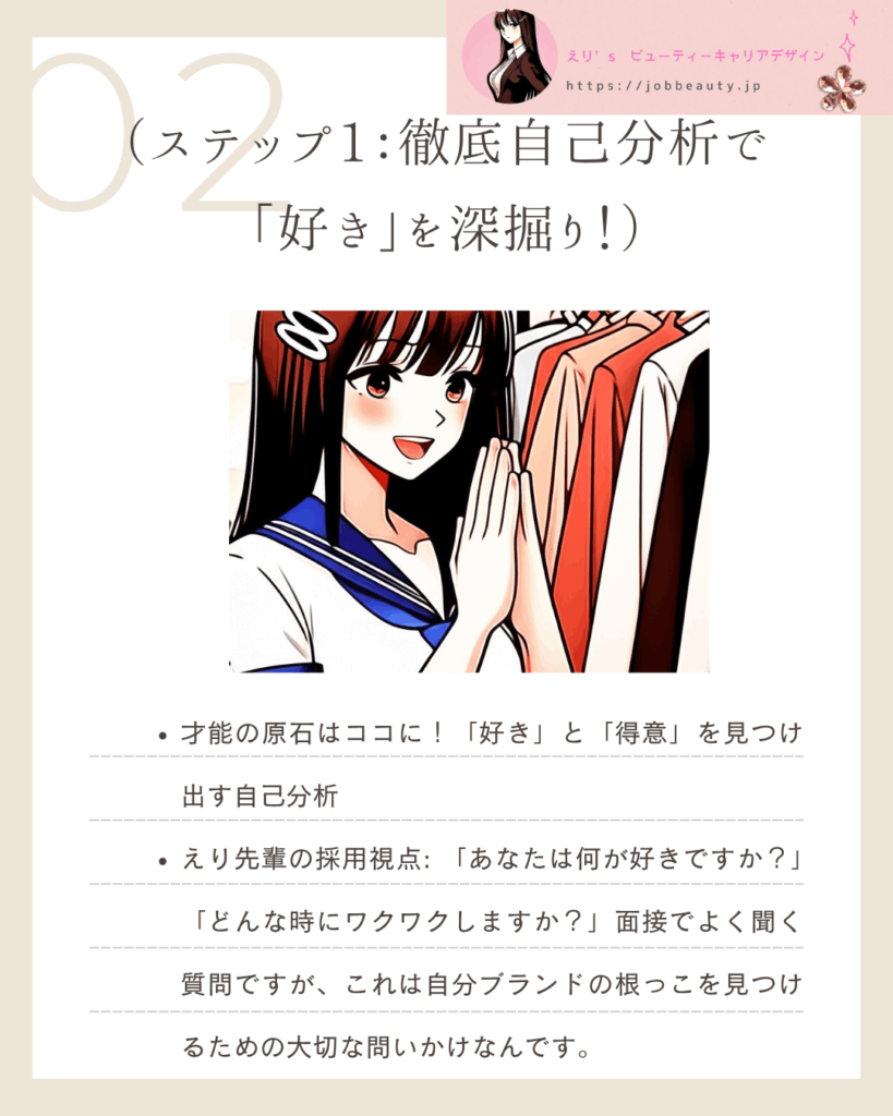 えり先輩の採用視点: 「あなたは何が好きですか?」「どんな時にワクワクしますか?」面接でよく聞く質問ですが、これは自分ブランドの根っこを見つけるための大切な問いかけなの。
