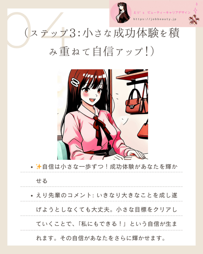 | ステップ3 | 小さな成功体験を積み重ねて自信アップ! | 心の軸:成功体験をストックし、揺るがない自信を熟成させる。 |