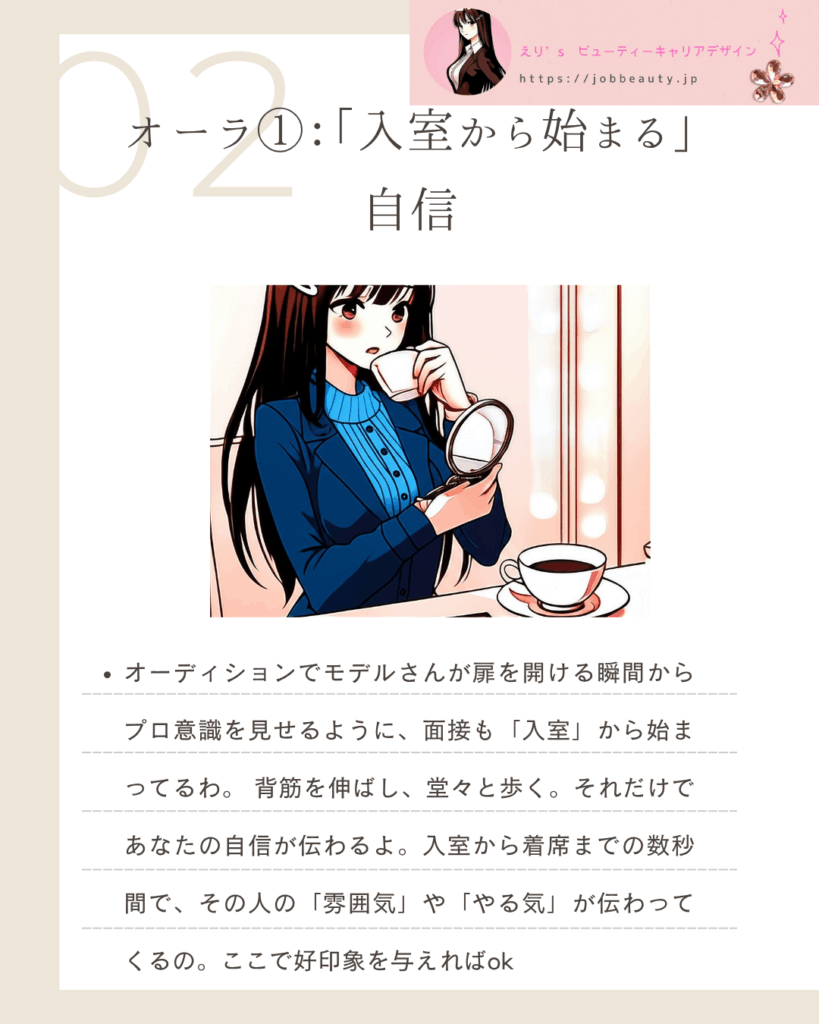 1. オーラ①:「入室から始まる」自信〜秒速で「この子だ!」と思わせる〜