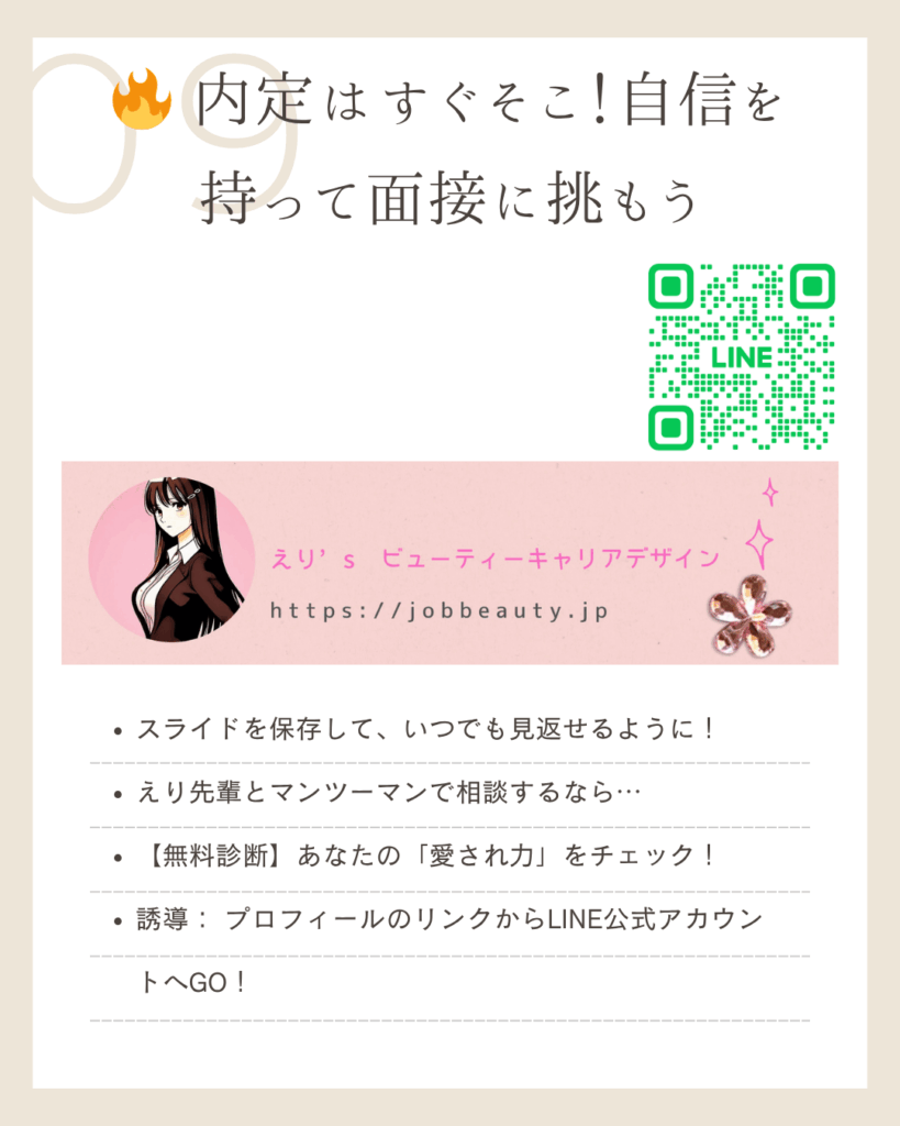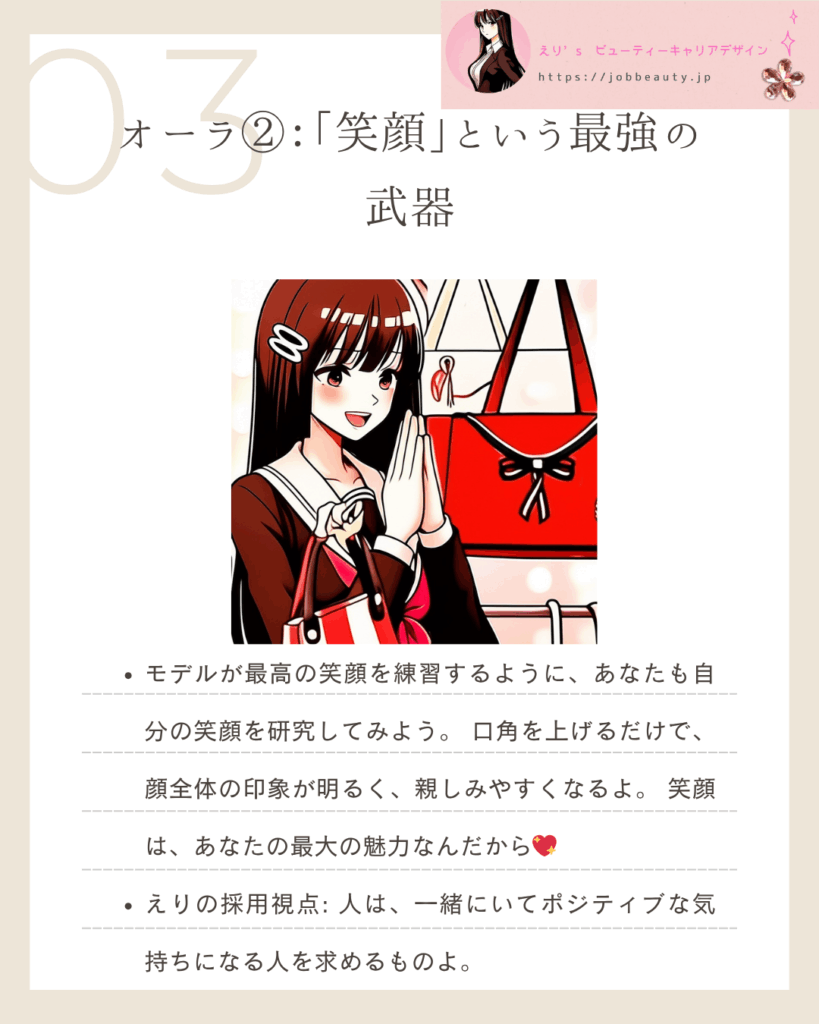 えりの採用視点: 人は、一緒にいてポジティブな気持ちになる人を求めるものよ。笑顔は、あなたが**「このチームに幸福をもたらす」**という最強のメッセージなの。