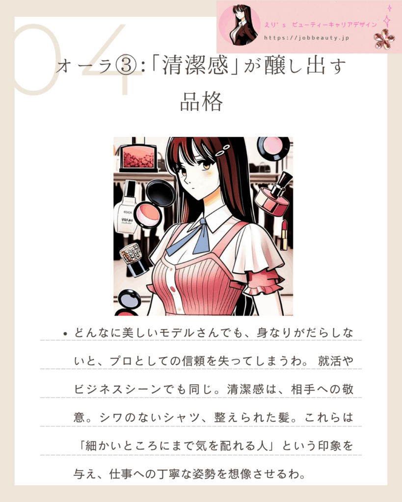 | オーラ③:「清潔感」が醸し出す品格 | 自己管理能力:細部に気を配れる丁寧さが、仕事への誠実な姿勢に直結する。 |