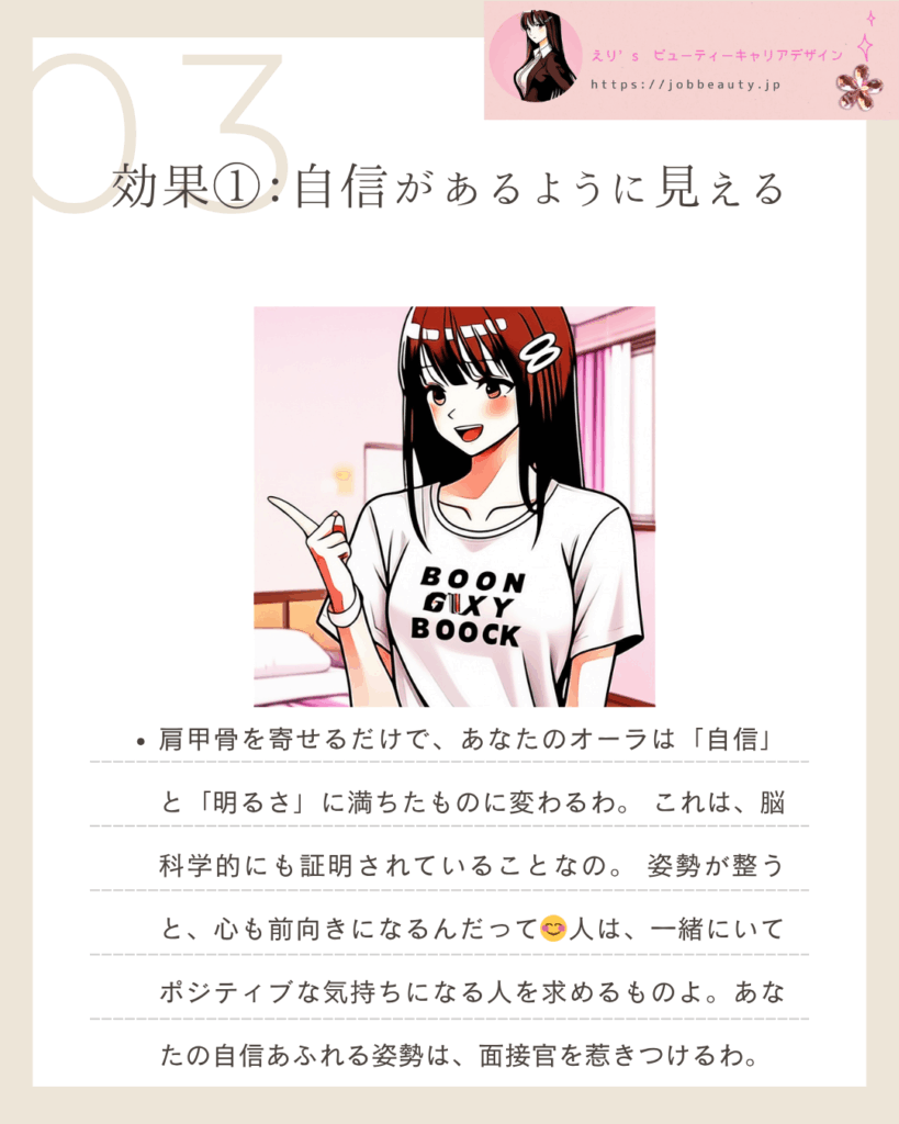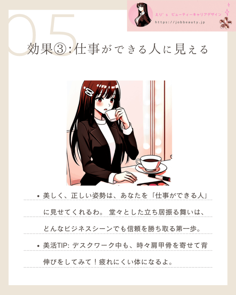 | 効果③:仕事ができる人に見える | 信頼の獲得:堂々とした立ち居振る舞いは、自己管理能力と誠実さの証。どんなビジネスシーンでも信頼を勝ち取る第一歩。 | ◻︎ デスクワーク中も、時々肩甲骨を寄せて背伸びをしてみて!疲れにくい体になるよ。 |