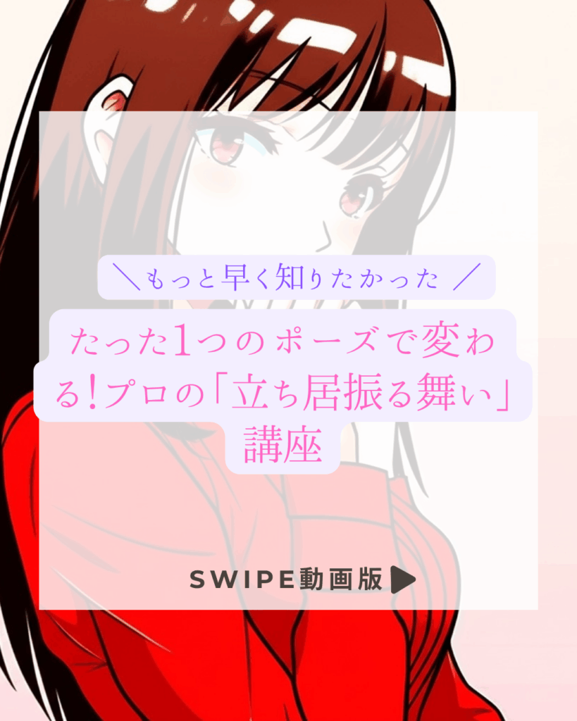 | 【会話ポーズ】体の角度を斜めに | 相手に正対せず、体を斜め30度に向ける。話す時は、時々相手に顔を戻す。 | 心地よさの提供:**「圧迫感を与えず、話しかけやすい」**というオーラを作る。 |