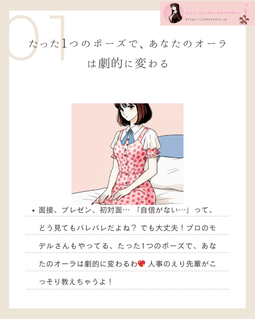 人事のえり先輩がこっそり教えちゃう。ポーズを戦略的に使うことが、あなたの**「なりたい未来」**への最短ルートよ!