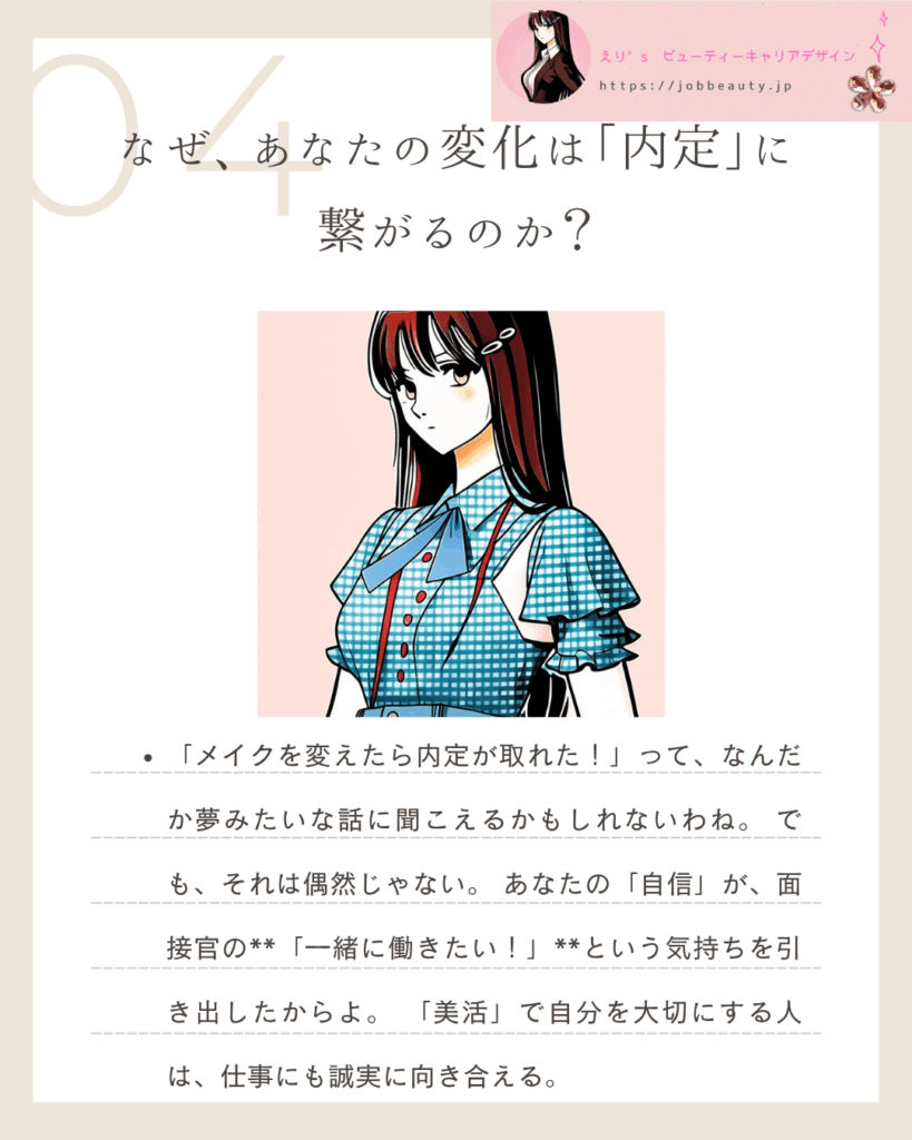あなたの**「自信」が、面接官の「一緒に働きたい!」**という気持ちを引き出したからよ。「美活」で自分を大切にする人は、仕事にも誠実に向き合えると人事は判断するの。