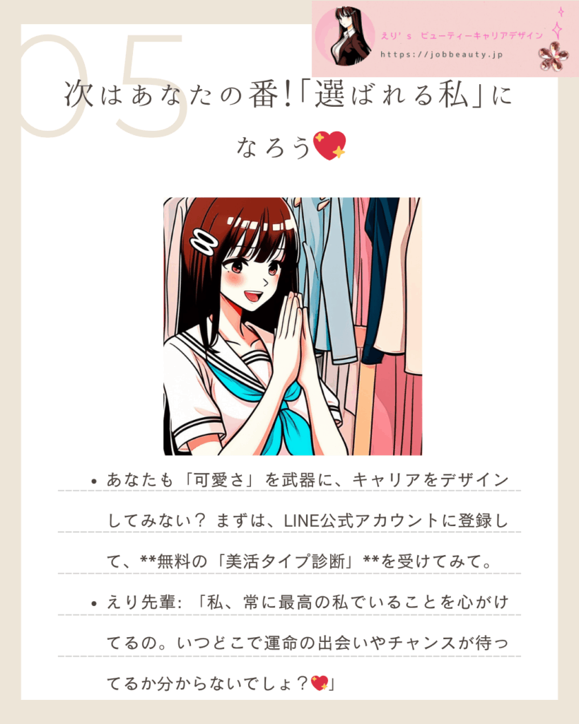 - Mちゃん(24歳・第二新卒)の成功体験と教訓「転職活動でずっと悩んでたけど、えり先輩の『個別コーチング』で自信を取り戻せました。今は、憧れの企業でキラキラ働けています✨」【えりの深掘り】 Mちゃんは、自分の**「好き」を仕事に繋げる自信がなかったの。美活を通じて「自分をプロデュースできる力」に気づいたことが、転職という新たな挑戦**を可能にしたのよ。
