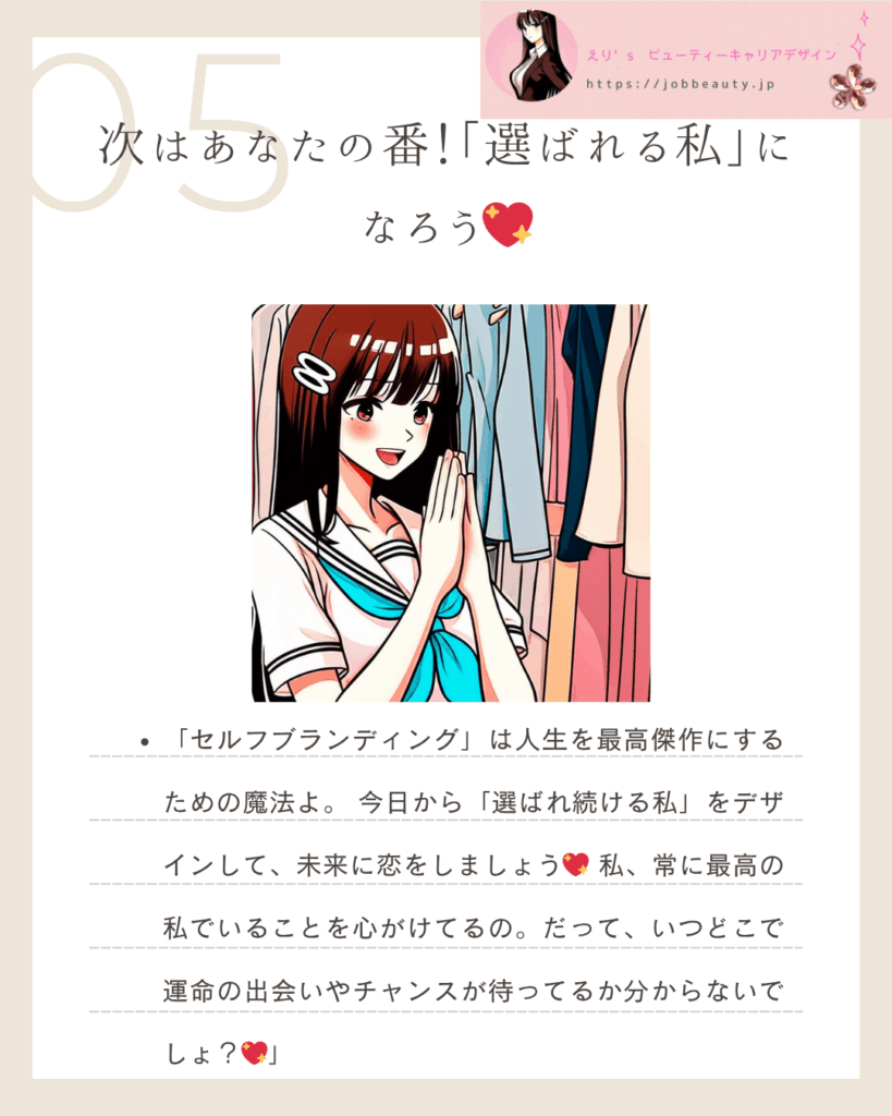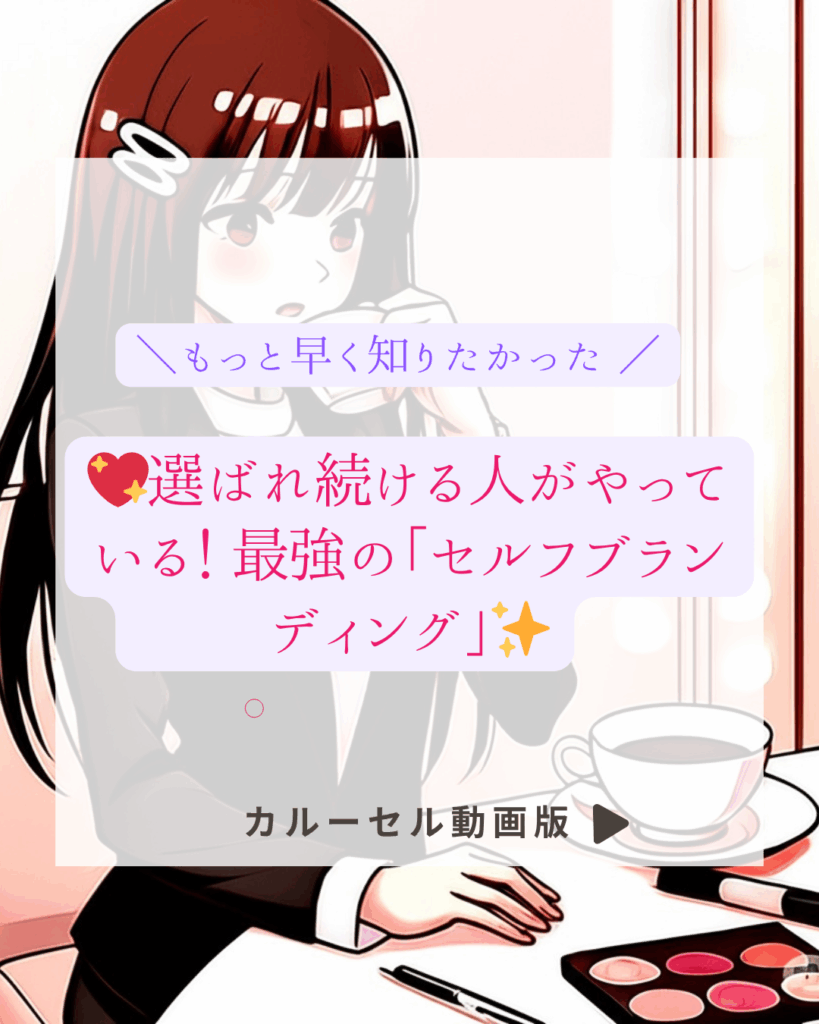 「セルフブランディング」は人生を最高傑作にするための魔法よ。今日から「選ばれ続ける私」をデザインして、未来に恋をしましょう💖