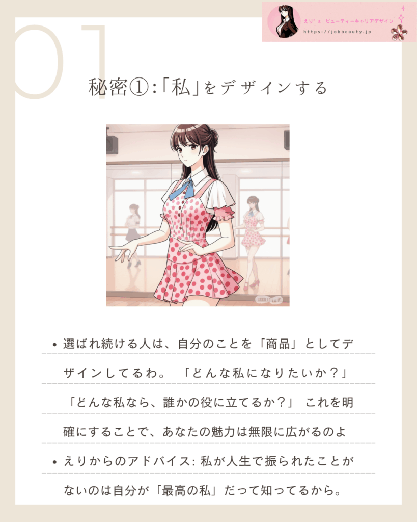 - えりからのアドバイス: 私が人生で振られたことがないのは、自分が**「最高の私」**だって知っているから。自己価値を自分で決めることが、デザインの第一歩よ。