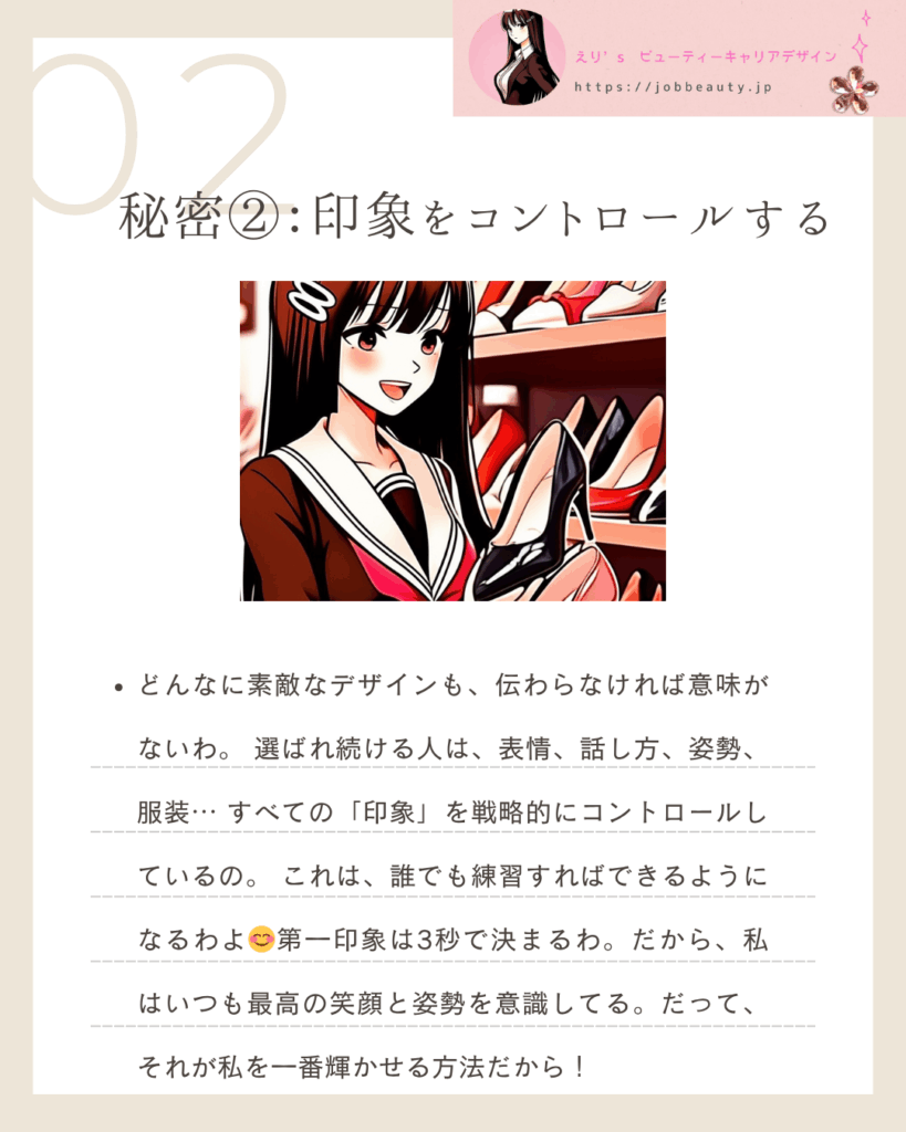 どんなに素敵なデザインも、伝わらなければ意味がないわ。選ばれ続ける人は、表情、話し方、姿勢、服装…すべての「印象」を戦略的にコントロールしているの。