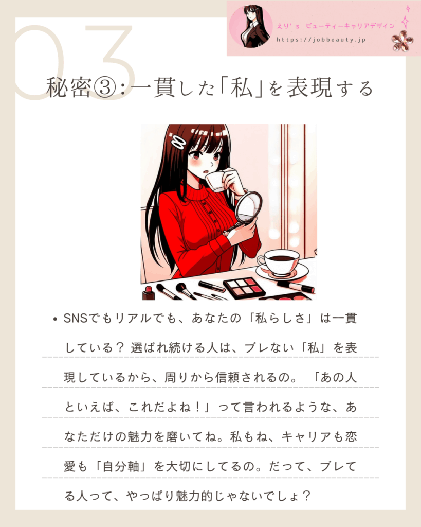 - えりからのアドバイス: 私もね、キャリアも恋愛も**「自分軸」**を大切にしてるの。だって、ブレてる人って、やっぱり魅力的じゃないでしょ?一貫性こそが、長期的な信頼を生むわ。