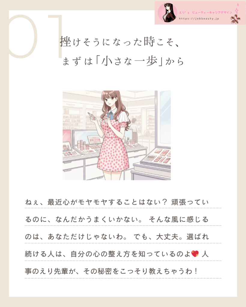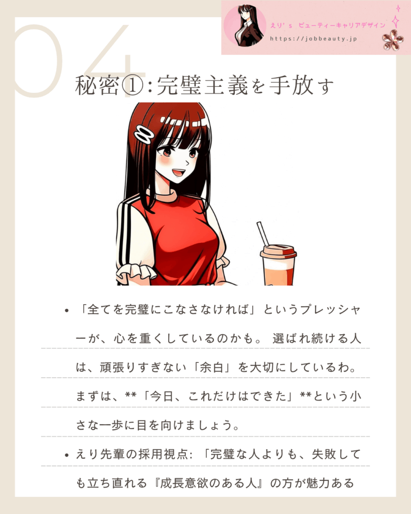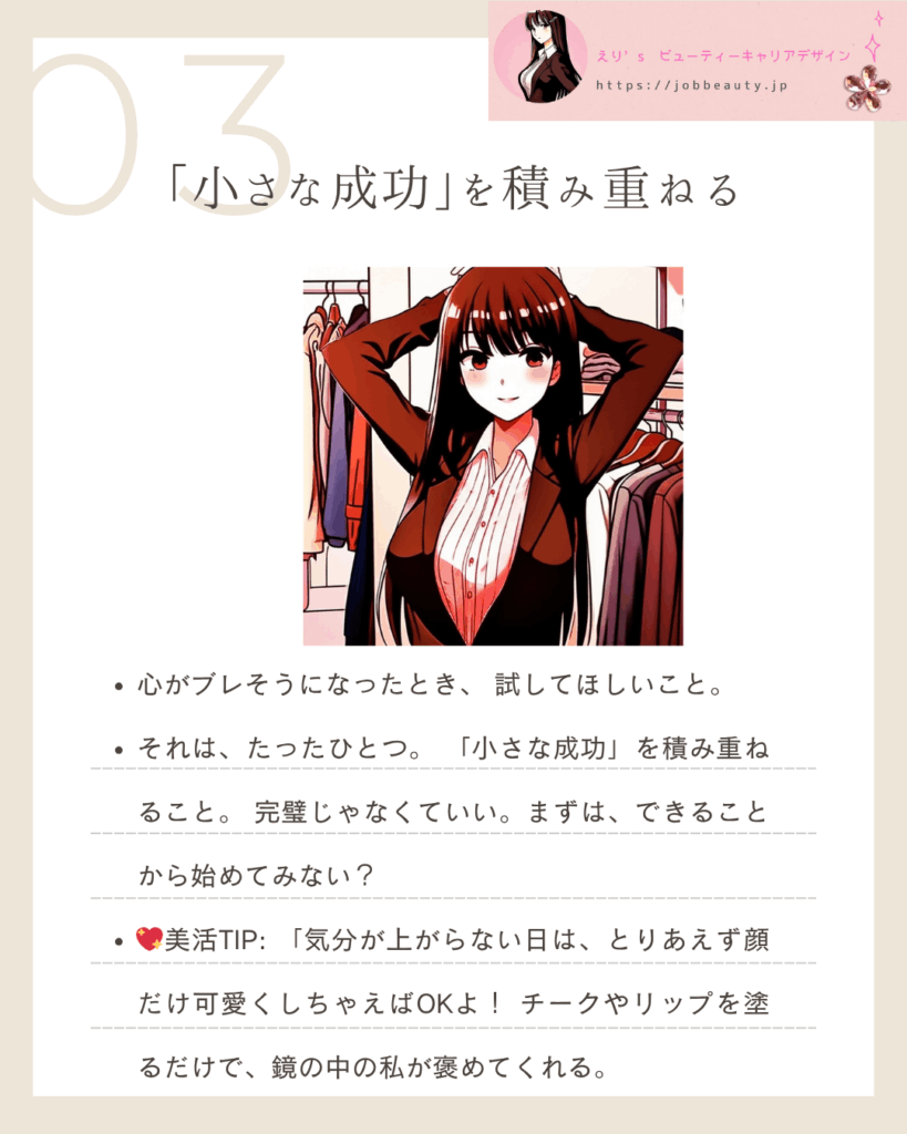 - 実践例: 朝、いつもより早く起きてメイクを完璧に仕上げる。たったそれだけでも、あなたは**「今日の私は最高にプロだ」**という小さな成功体験を得られるわ。
