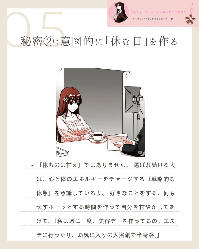 - 「あなたのスマホのスケジュールに、『何もしない日』の予定が入っているかしら? 疲れてから休むんじゃなくて、疲れる前に休むのがプロの鉄則よ。」