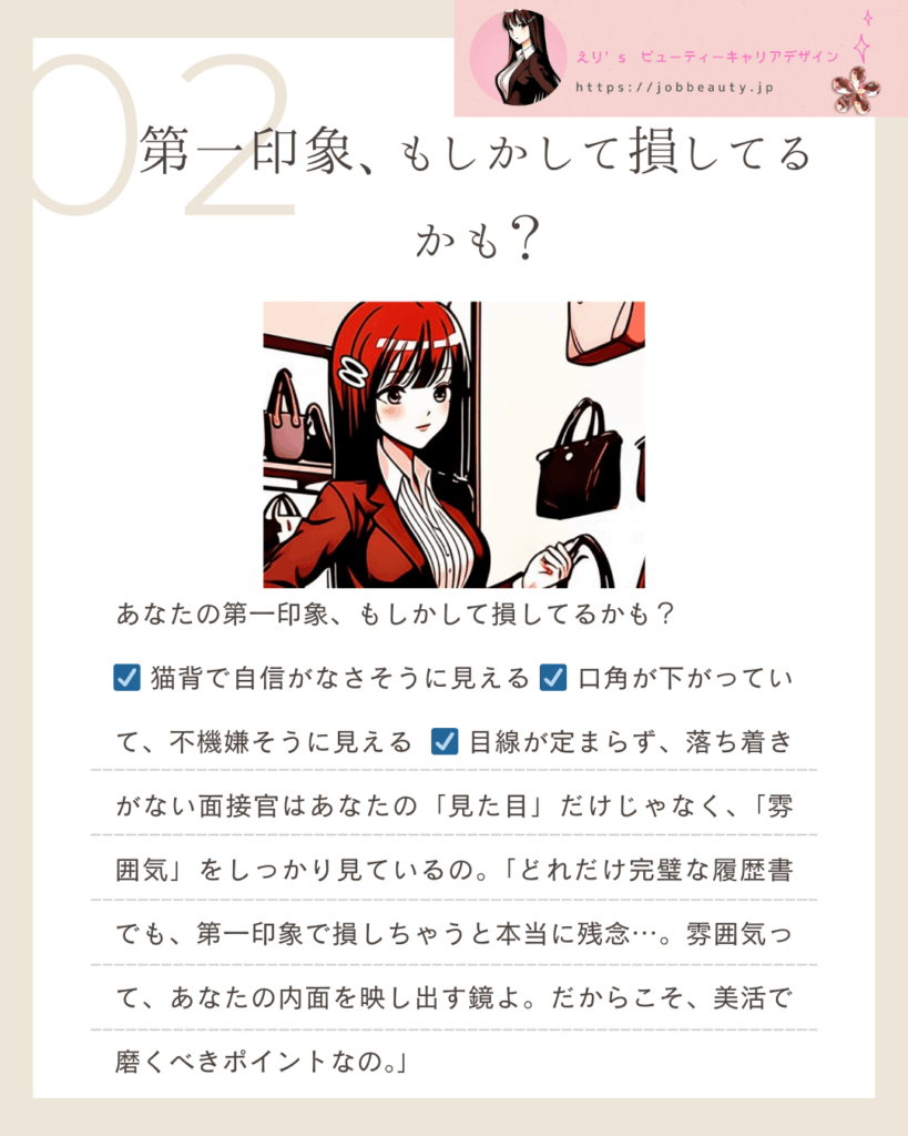 【えり’sアドバイス】 「猫背は、あなたの自信を半減させる『鎧』よ。胸を開く姿勢は、あなた自身に『大丈夫、あなたはプロよ』と語りかけているの。姿勢を正すだけで、あなたのオーラは3倍になるわ!」