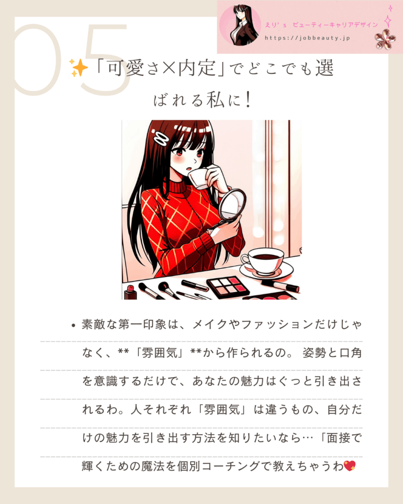 人事のえり先輩が、あなたの魅力を最大限に引き出し、「選ばれる私」になるための雰囲気美人戦略を、たっぷり解説するわね。