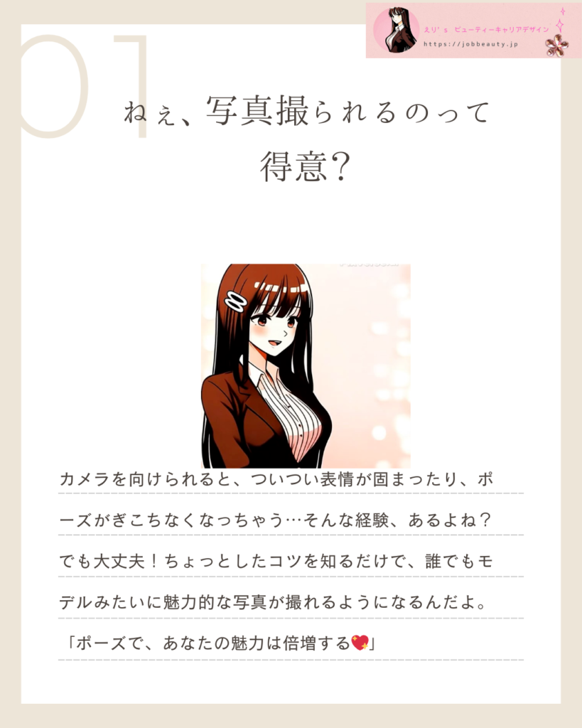 えり先輩: そうよね。でも、「写真を撮られる時」って、実は「自分を表現する最高のチャンス」なの。記念写真はもちろん、証明写真、SNSのプロフィール、企業の採用サイト…すべてがあなたというブランドのプレゼンになるわ。
