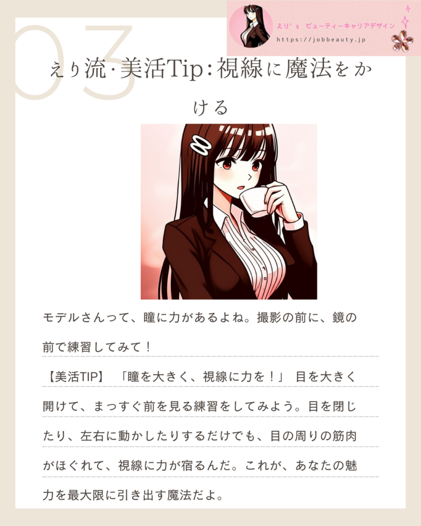 えり先輩: そこで、まず覚えてほしいのは、**「視線は自信の証明」だということ。カメラに向かって堂々と視線を送ることが、「私はここにいるよ!輝いているよ!」**という最高のメッセージになるわ。
