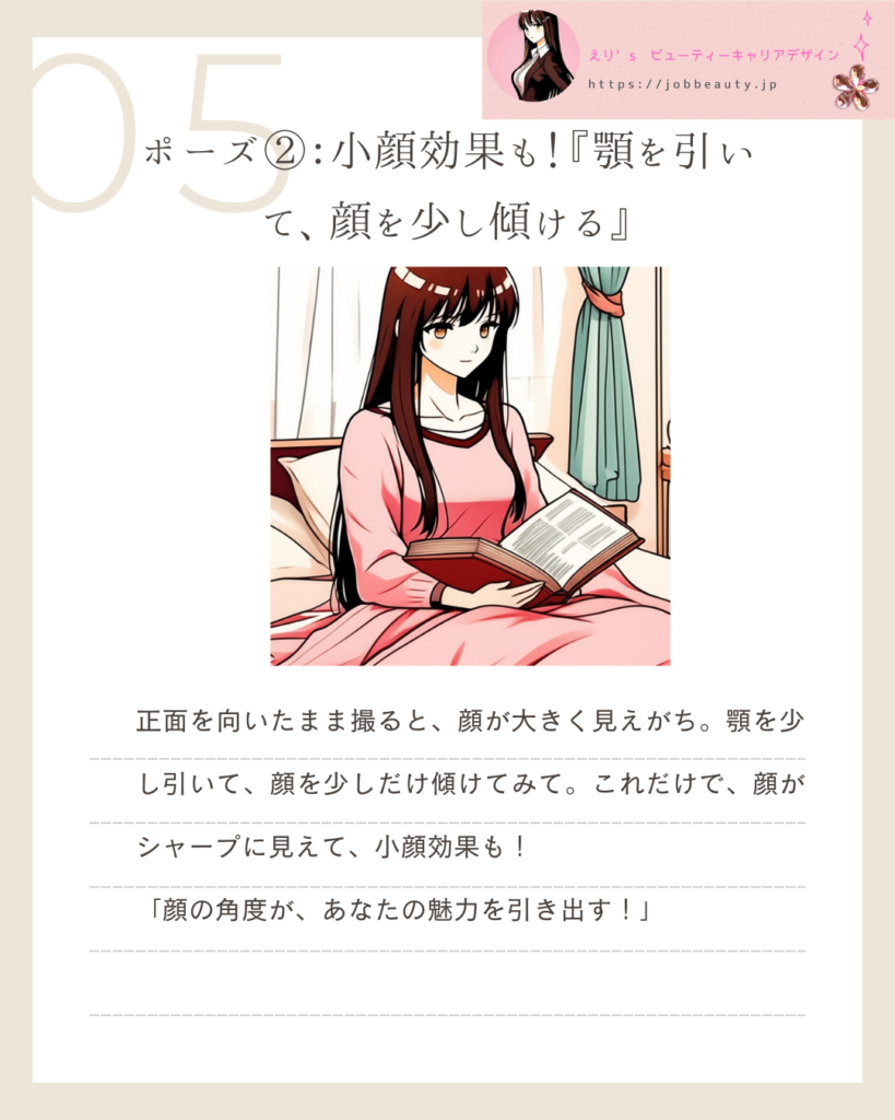 えり先輩: 正面を向くと、顔の形がそのまま出てしまうわ。少しの角度が、あなたのベストな輪郭を引き出すの。