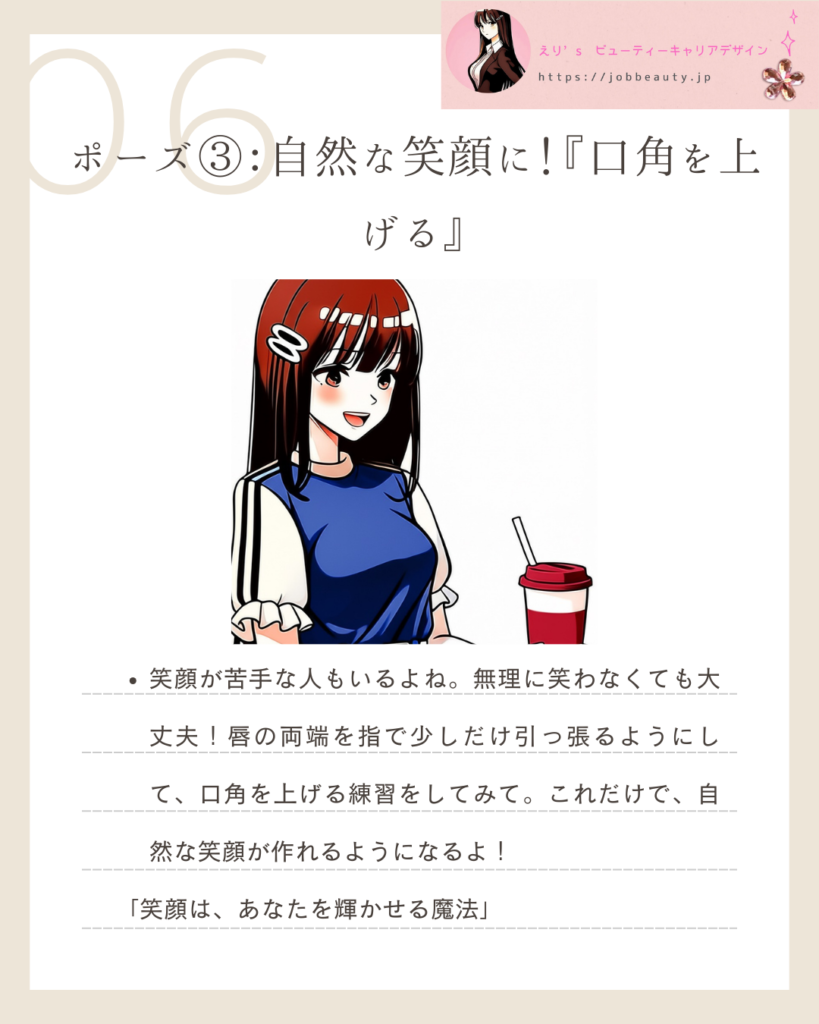 - アクション: 笑うのが苦手なら、まず口角だけを、指でクイッと持ち上げるイメージでトレーニング。