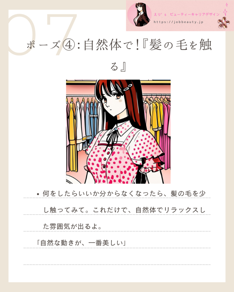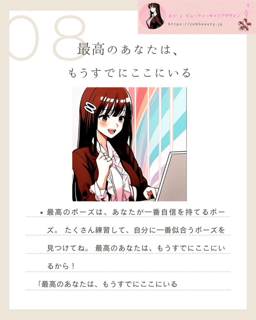 みんな、ポーズは**「内側の自信」を引き出す最高のスイッチよ!鏡の前で練習して、「今日から私もモデル気分!」**を合言葉に、最高の自分を表現して!