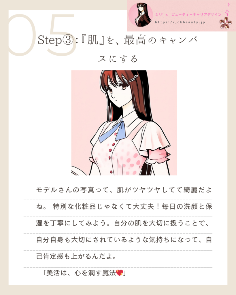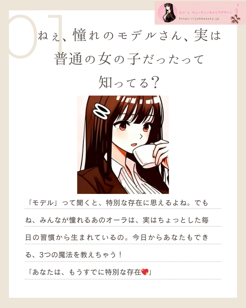えり先輩: 実は、憧れのモデルさんも、最初から完璧なわけじゃないの。彼女たちは、**「オーラの作り方」**を知っているだけ。今日からすぐに実践できる、3つの魔法のステップを教えるわね!