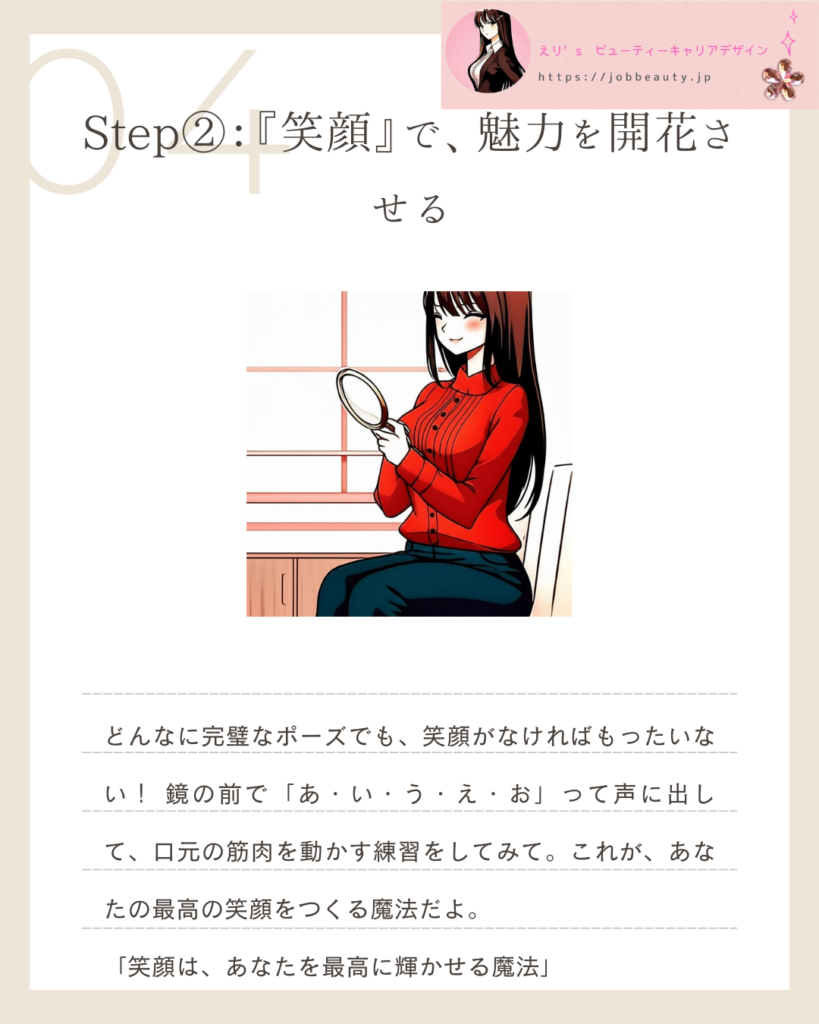 えり先輩: 最高の笑顔は、**「私は幸せです」**という、周りを惹きつける最強の武器よ。