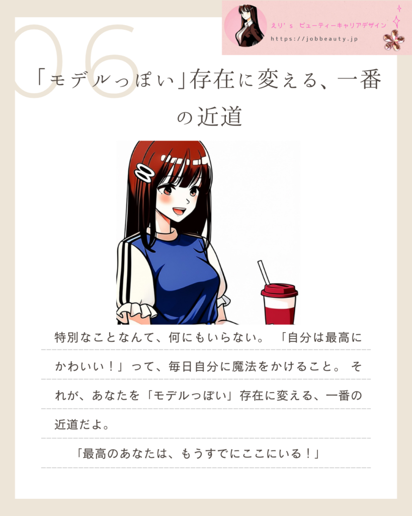 えり先輩: もちろんよ!今日のテーマは、まさにそれ。「特別な誰か」じゃなくて、あなたの中に眠っている「モデルっぽい私」を目覚めさせる魔法よ。