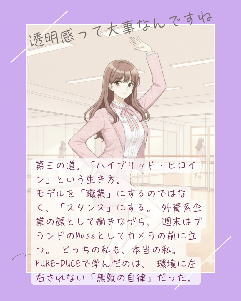 | 時間の使い方 | 仕事か、レッスンか。 | 平日の「画面越しのオーラ」が、週末のモデル仕事に直結する。 |