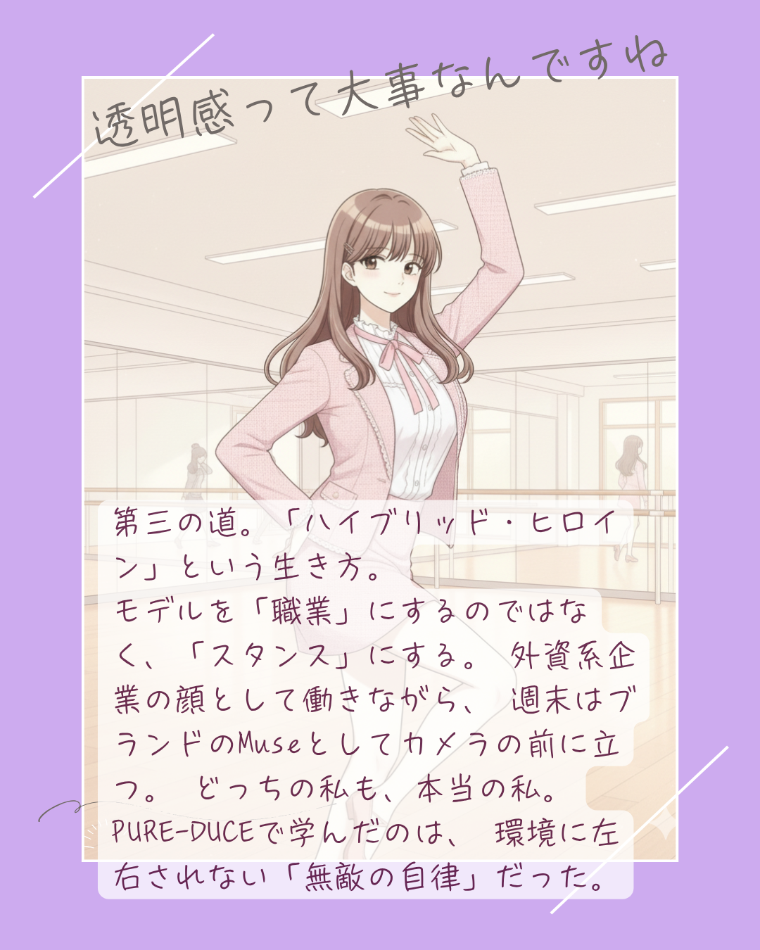 「普通の幸せ」を土台にして、「忘れられない夢」を咲かせる。 そんな欲張りな生き方こそ、PURE-DUCEが提唱する**「美しき自律」**の完成形です。