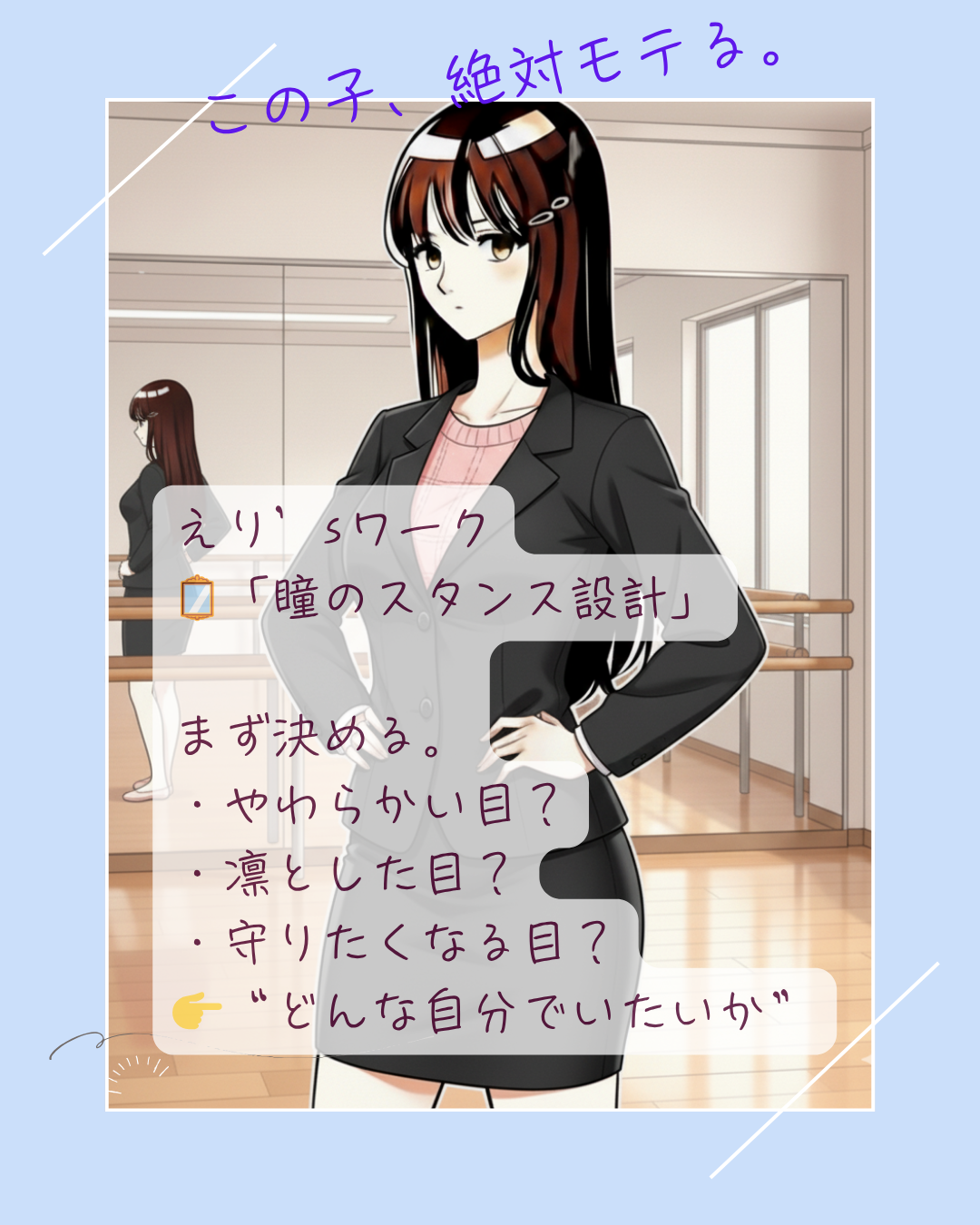 | 🌸スタンス言語化 | 「やわらかい」「凛としてる」など理想の瞳を一言で決める | 印象がブレなくなる | まず“どう見られたいか”を決めることで、無意識の動きが整う |
